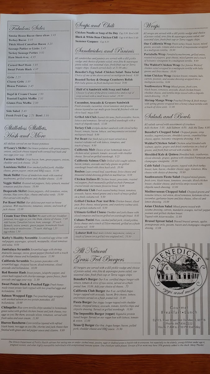 Baby spinach, asparagus, red and yellow peppers, garlic, scallions, low-fat mozzarella, egg whites, multigrain tortilla. Fruit/Potato/No Side: Breakfast Potatoes, Fresh Fruit