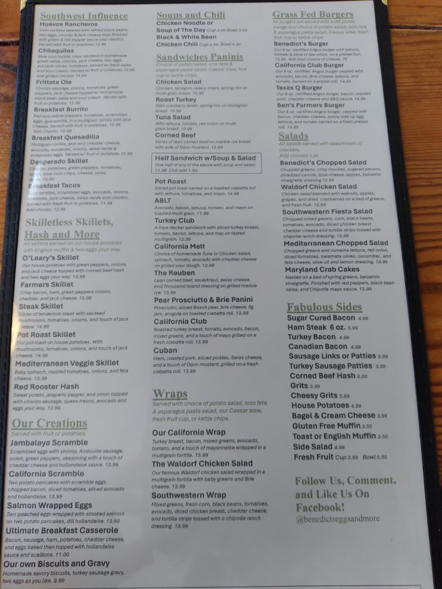 We start with our breakfast potatoes, two eggs as you like them, choice of cheese ($7.95). Add bacon, Canadian bacon, ham, sausage ($0.95) each. Spinach, onion, tomato, green pepper, homemade black bean salsa or mushrooms ($0.75) each. Cheese Choice: cheddar, Swiss, feta, American, jack, low fat mozzarella